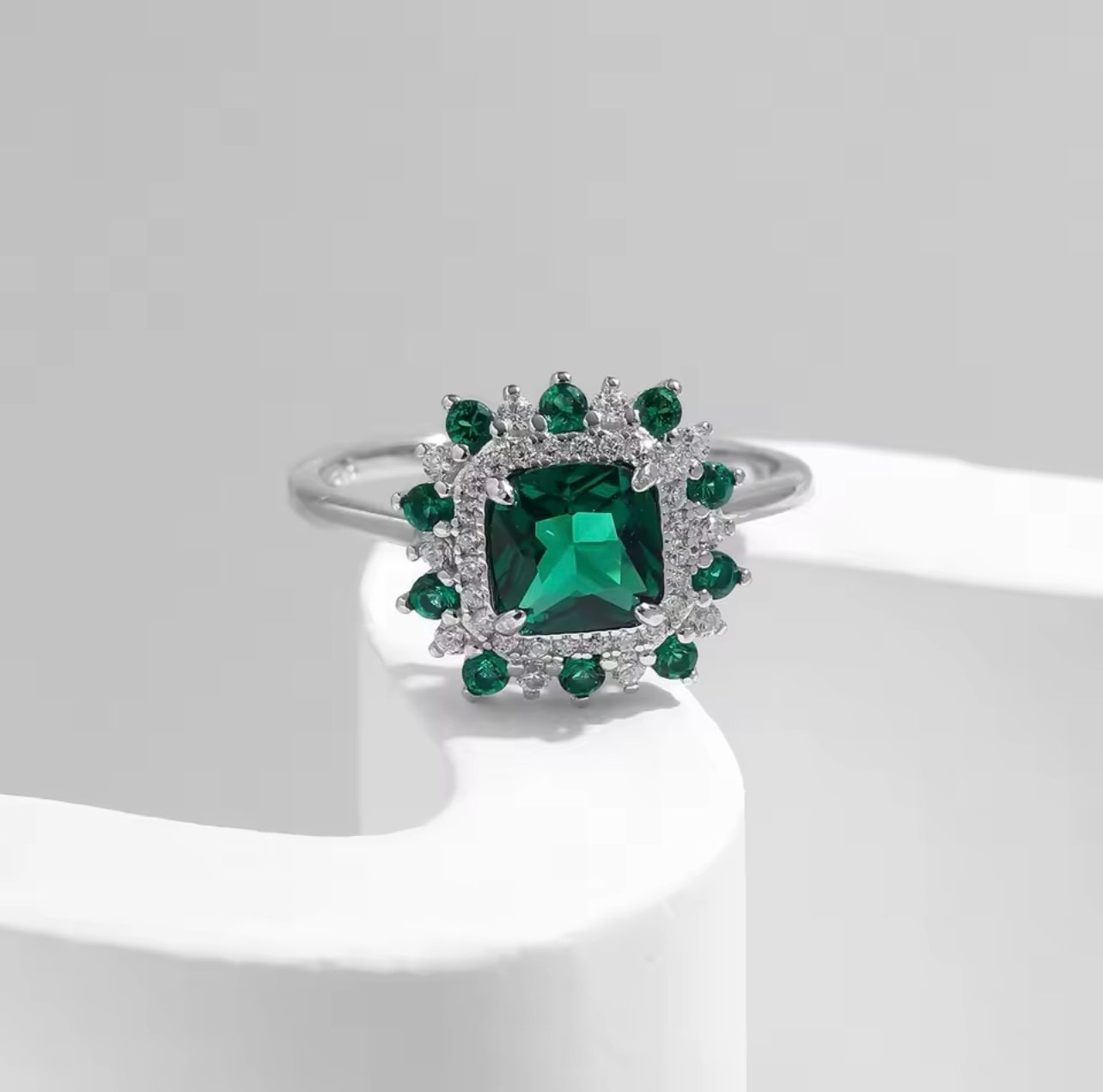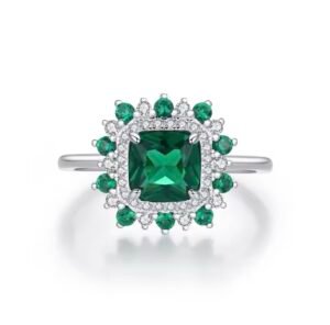 Anel em prata 925 com pedra central verde em destaque, rodeada por delicadas zircônias cravejadas que intensificam o brilho da peça. Um design sofisticado e elegante, perfeito para quem ama joias marcantes e cheias de charme.