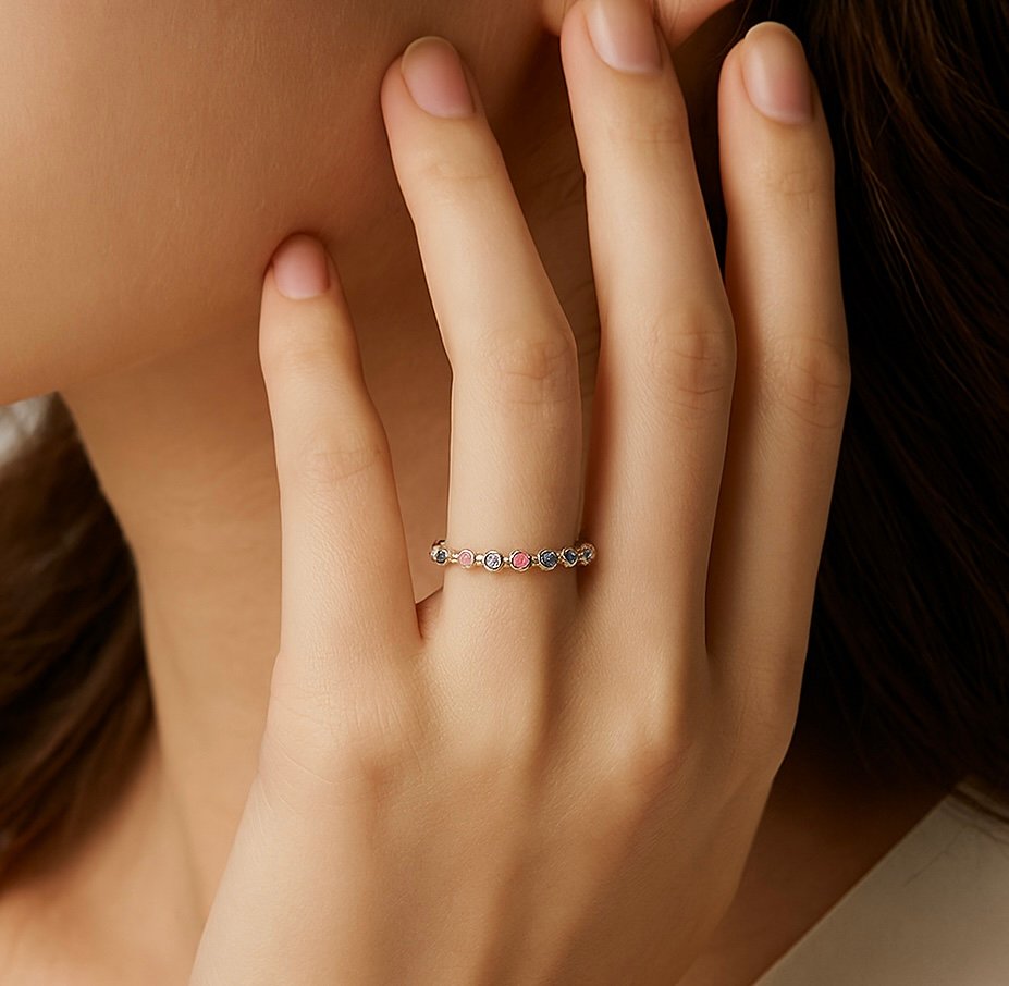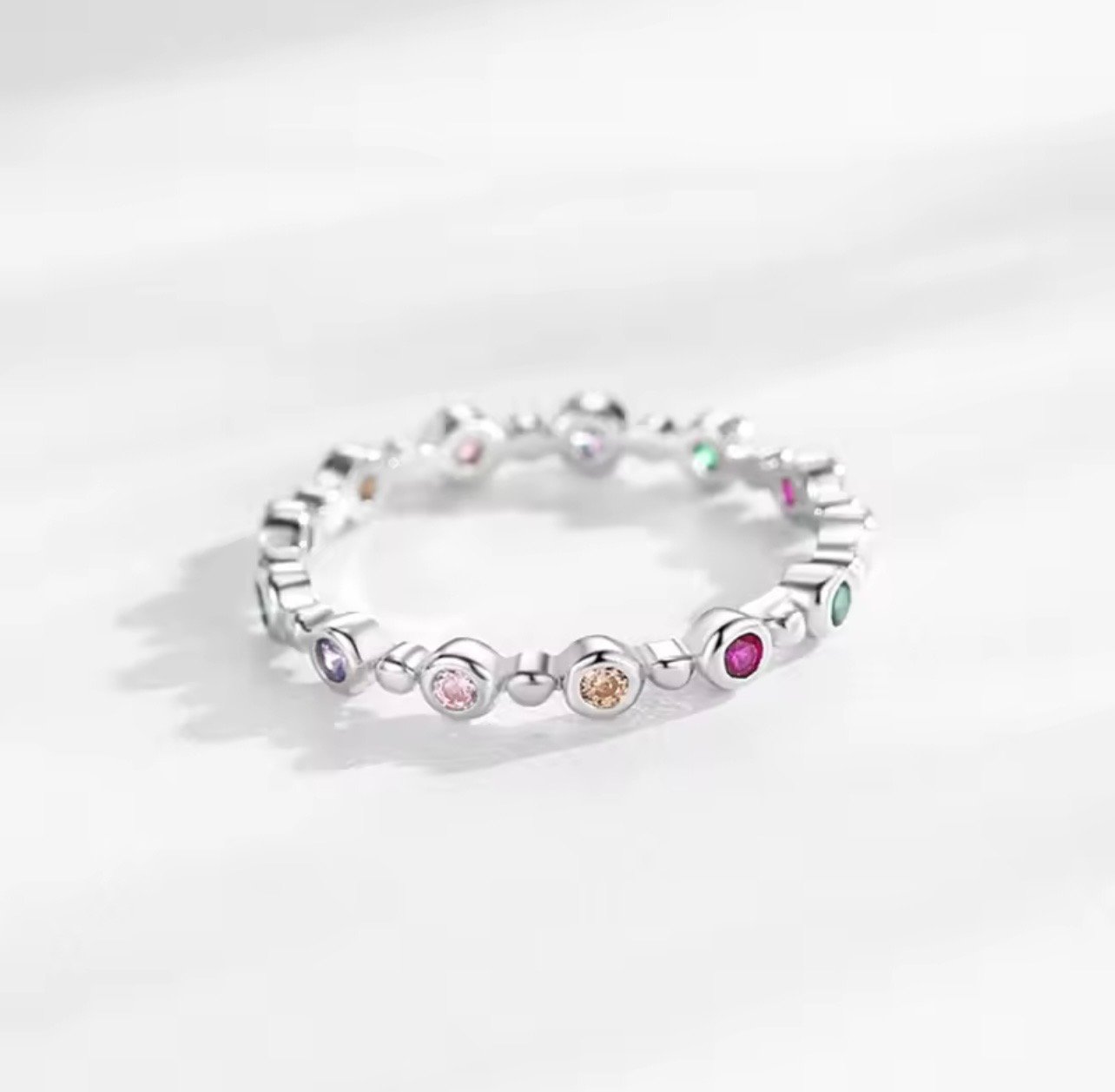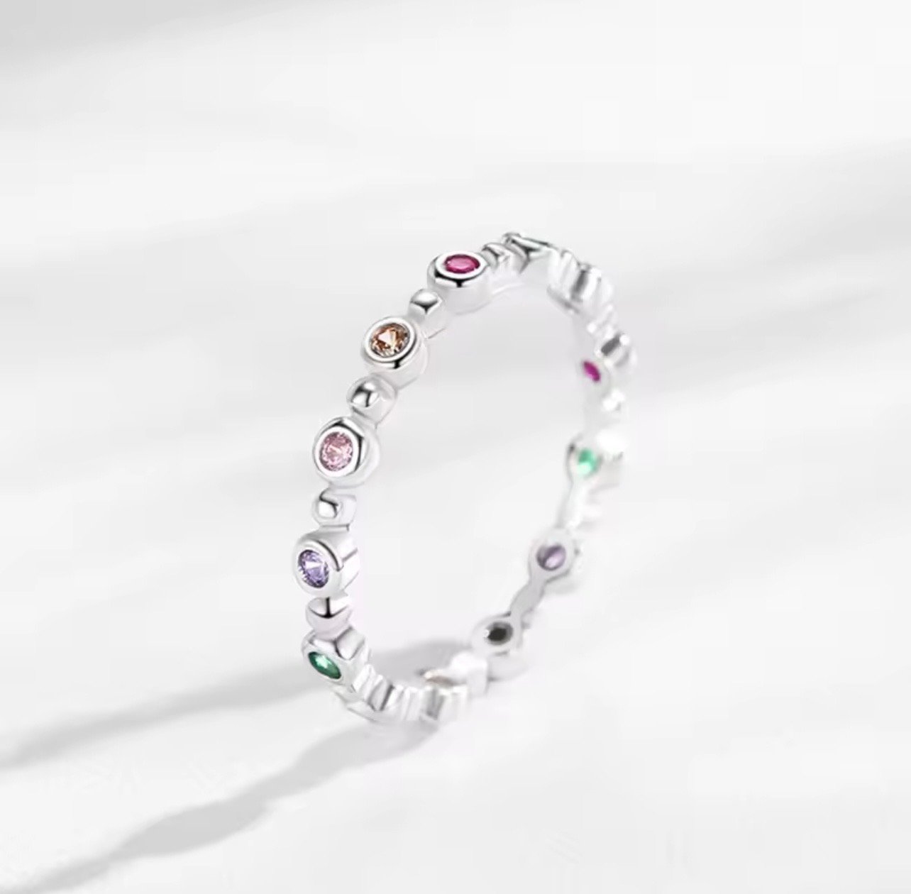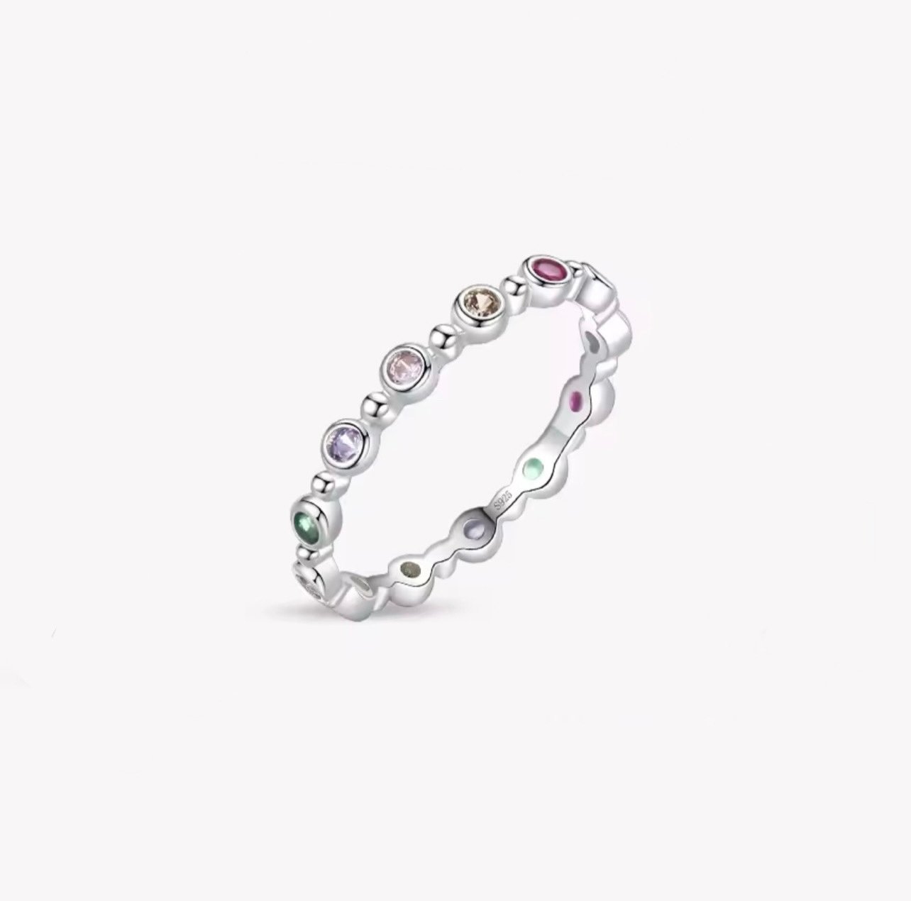 Anel em Prata 925, todo cravejado com zircônias coloridas, que trazem brilho e alegria à peça.