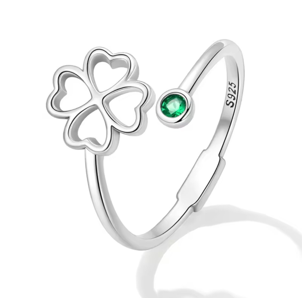 Anel ajustável em Prata 925, e símbolo de trevo e a palavra “lucky” gravada.