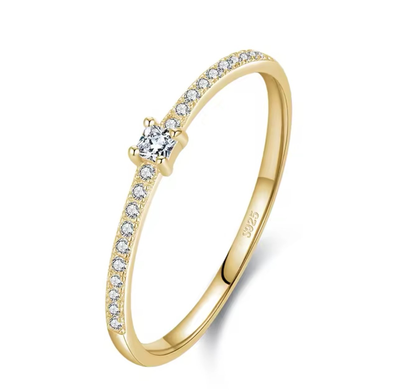 Anel em Prata 925 com Banho de Ouro 18K, meio cravejado com zircônias e ponto de luz quadrado central.