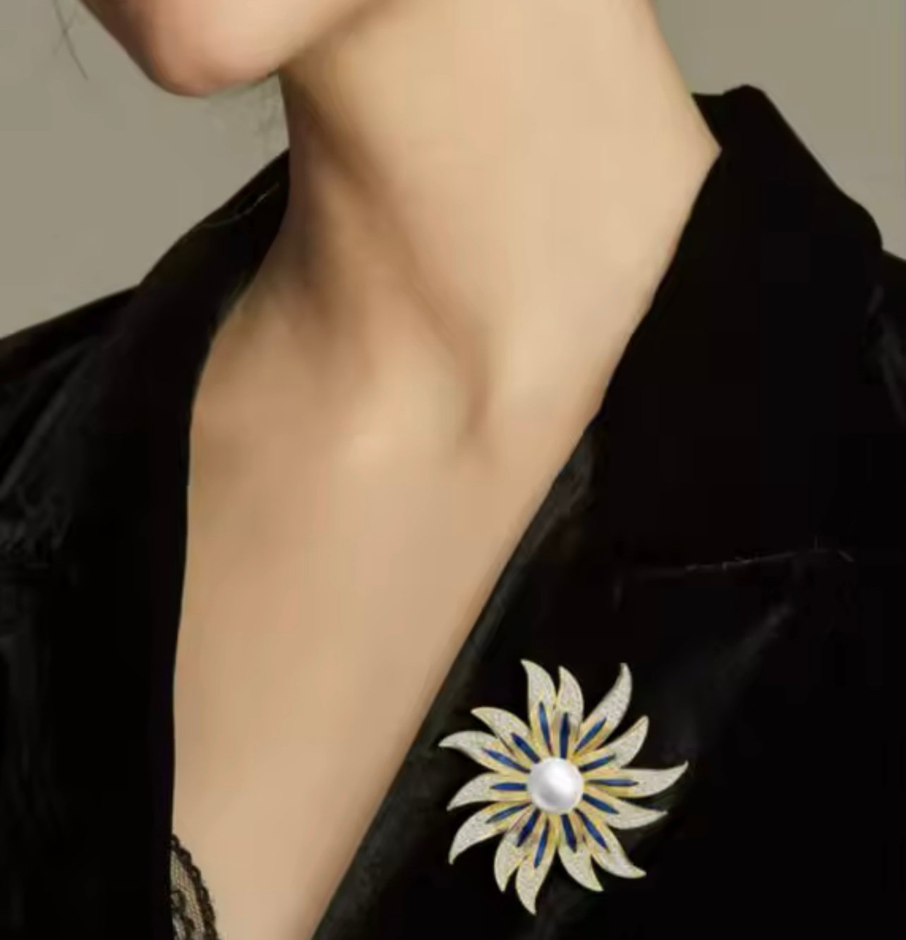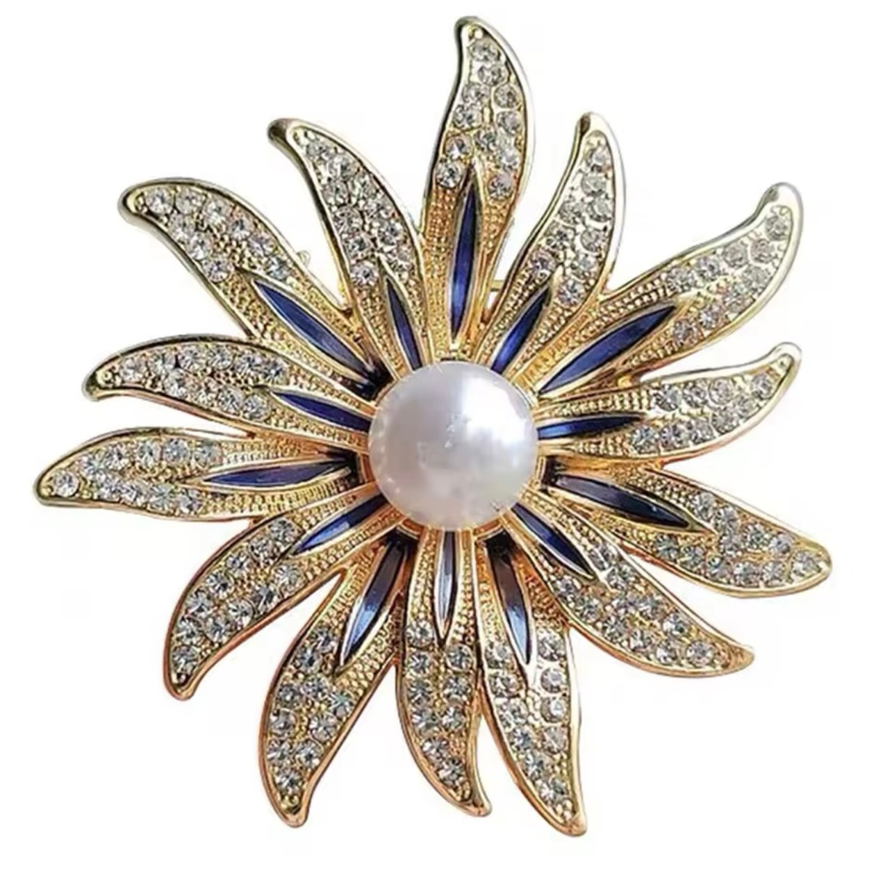 Broche Flor Pérola Azul Dourado